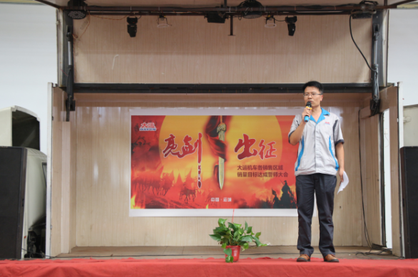 下午14:30,誓師大會在主持人的宣布中正式拉開帷幕。大運機車銷售副總助理盧傳祥首先上臺,對本次營銷精英誓師大會的開幕作了致辭,他希望我們大運機車的銷售精英們,能夠在9月份披荊斬棘,乘風破浪,達成目標。