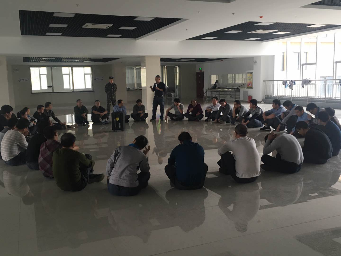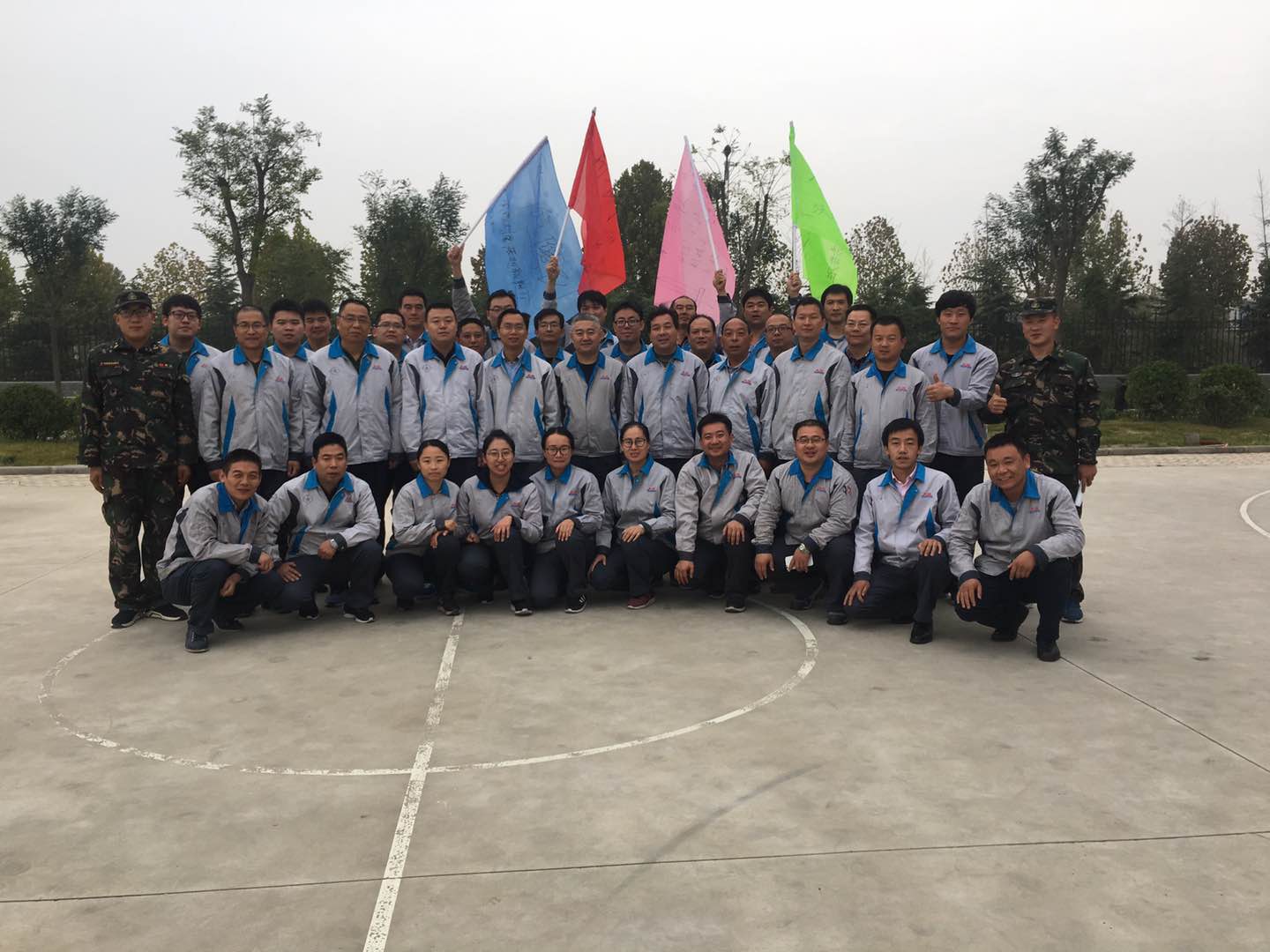 在開營活動中,培訓教官通過生動有趣的熱身游戲使干部們做到“三個忘記”:忘記年齡、忘記工作身份、忘記性別,使大家拋開一切,全身心的投入到訓練中。團隊組建環節中,大家組成四支斗志昂揚的隊伍,充分發揮團隊合作精神,集思廣益,“起隊名”、“唱隊歌”、通過不同的造型展示自己團隊最好的精神風貌。在“支援前線”和“搶灘登陸”環節中,四支隊伍你追我趕,互不相讓,每個人都發揚不怕吃苦、無私奉獻的精神,為了團隊的榮譽,有的干部甚至脫掉了外套、鞋子、襪子,光腳站在水泥地上,為團隊榮譽而戰,力爭第一;最后的“穿越電網”環節,活動雖然失敗三次,但是仍然不放棄,在隊長和指導員的帶領下,總結經驗,發揮團隊凝聚力和執行力,終于在第四次的行動中,成功完成挑戰,歡呼聲響徹訓練場,每個人的臉上都洋溢著成功的喜悅。