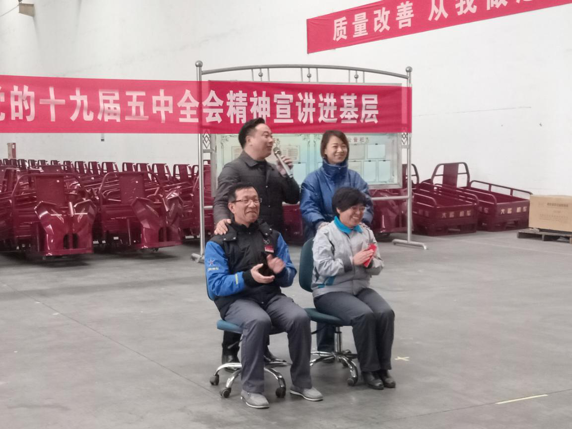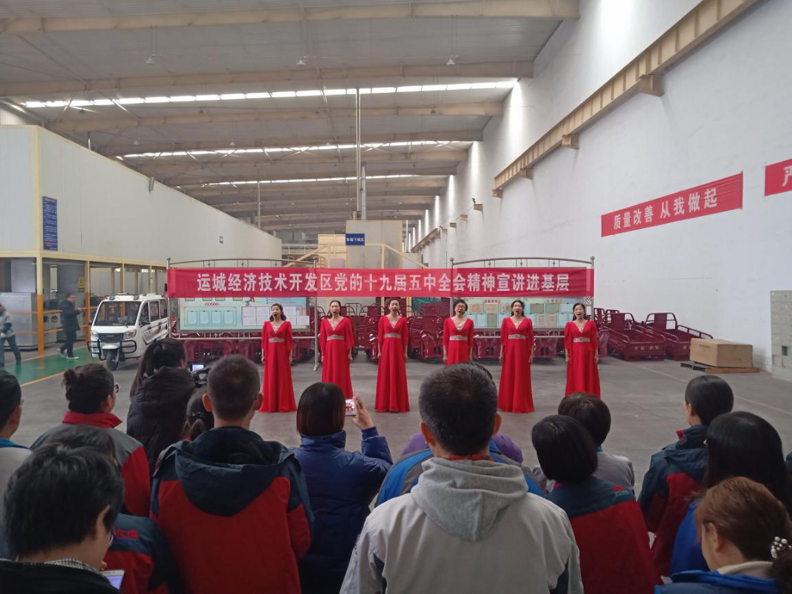 12月11日,運城經濟技術開發區總工會來到大運機車有限公司,開展黨的十九屆五中全會精神宣講。為引領廣大職工群眾聽黨話、跟黨走,進一步豐富職工的文化生活,此次通過快板、合唱、現場提問等大家喜聞樂見的方式開展。